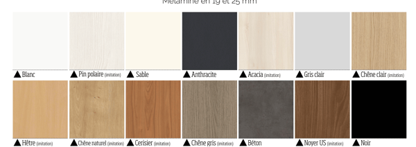 En mélaminé ép 19 mm haute densité (680kg/m3), chant ép 2 mm