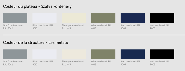 Structure en tube d’acier Ø30 mm, épaisseur 2 mm, finition peinture poudre époxy.