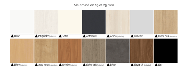 En mélaminé ép 19 mm haute densité (680kg/m3), chant ép 2 mm