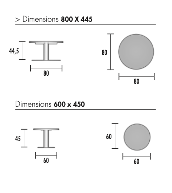 Cette table basse a une hauteur de 45 cm et deux versions de diamètre disponibles : 60 et 80 cm.