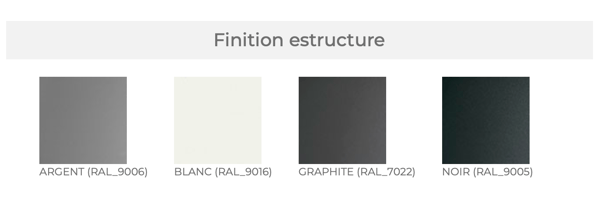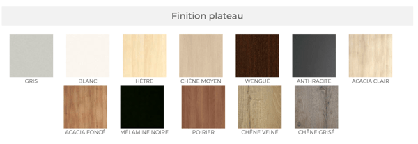 Finitions: graphite, blanc, gris, hêtre, chêne moyen, poirier, wengué, acacia clair, acacia foncé, noir, chêne veiné et chêne grisé.