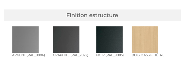 Composés d’une traverse de 50 x 30 x 2 mm fabriquée en tube d’acier laminé à froid de finitions en peinture époxy argent (RAL 9006), graphite (RAL 7022) ou noir (RAL 9005) et de 2 montants ronds en bois de Ø73 mm sur la partie supérieure et qui diminue progressivement jusqu’au Ø38 mm sur la partie inférieure.