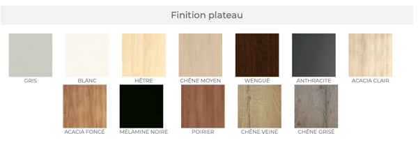Plateaux mélaminés: 25 mm d’épaisseur recouvrement en mélamine de 120 g/m2 pour les deux côtés et une densité de 630 ± 5 kg/m3.